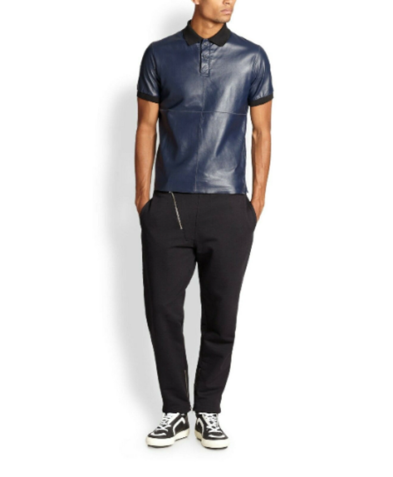 NOORA Classic Men's Blue Lambskin Leather T- Shirt with Rib Collar |GYM Leather T-shirt | Navy Blue Leather T-Shirt SU0156