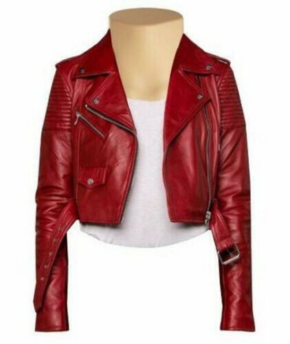 Noora Womens Leather Cropped Biker Style Jacket, Red Belted Jacket, Party Wear Jacket, Celebrity Jacket SK16