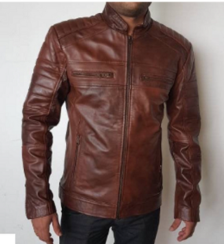 NOORA Mens Brown Colour Lambskin Leather Quilted Biker Jacket With Zipper & Pocket | Band Collar | ST066