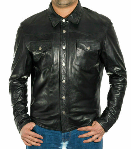 Noora Mens Gents Black Adjustable Collar Casual Shirt Soft Leather Shirt Jacket