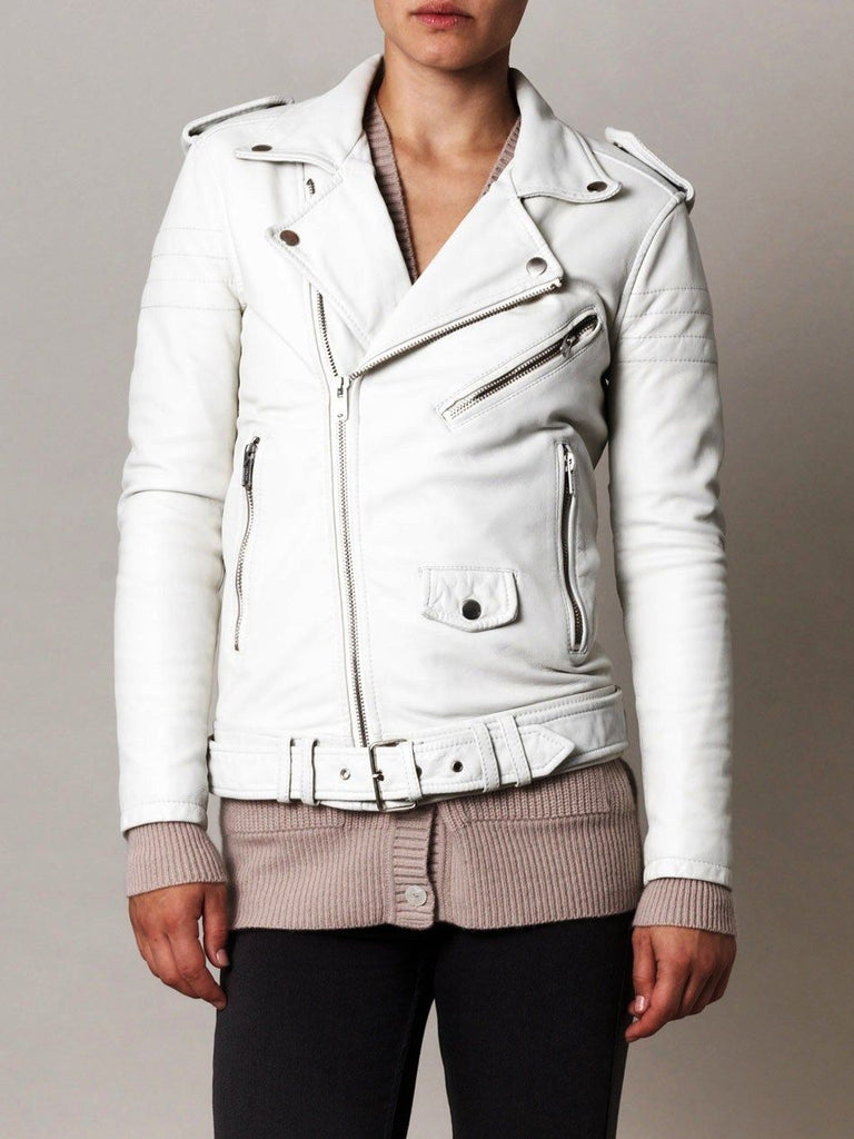 Noora Women's White Biker Motorcycle Leather jacket with Belt ST0322 – Noora International