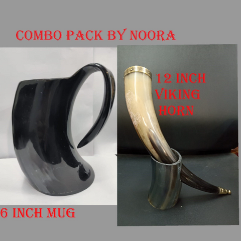 COMBO PACK Of Handcrafted 6 Inch Horn Beer Mug & 12 Inch Large Viking Drinking Horn with Horn Stand for Beer Lovers, Goblet Natural Wine| 100% Leak Free YK01