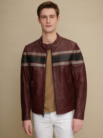 NOORA Men's Lambskin Leather Maroon Biker Jacket With Black Strips, Racer Jacket & Zipper Slim-Fit Casual Leather Jacket
