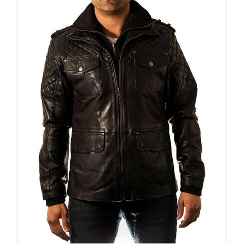 Noora Men’s black leather bomber jacket With Zipper & Pocket | Quilted Bomber Jacket |