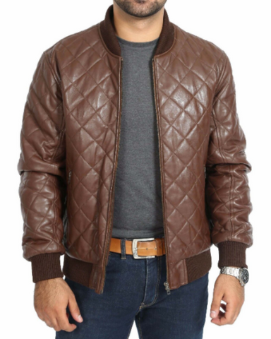 NOORA Men's Lambskin Leather Classic Diamond Brown Leather Jacket , Mens Quilted Jacket With Zipper & Pocket | rt345