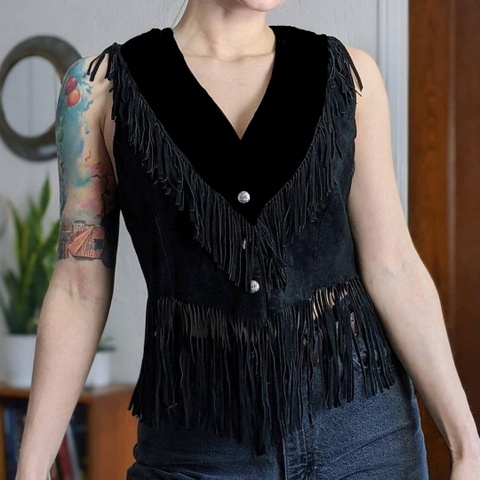 NOORA Womens Handmade Black Suede Fringe Jacket | Waterfall Jacket | Sleeveless Jacket | ST0106