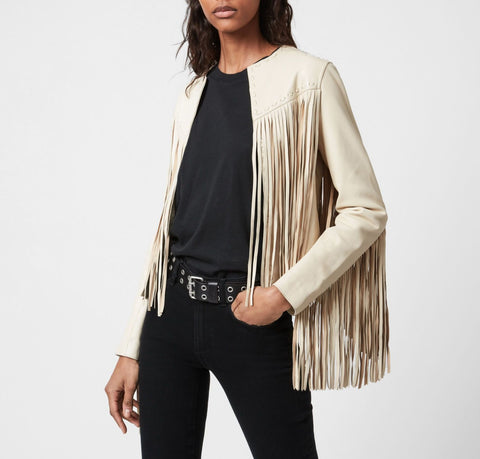 NOORA Womens Lambskin Off White Leather Fringe Style Jacket, Slim Fit Party Wear Tassel Designer Jacket YK0254