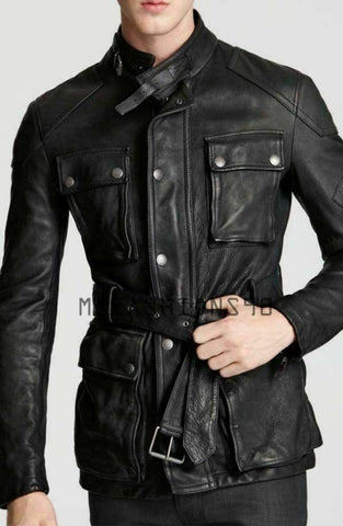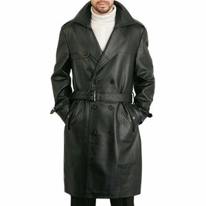 NOORA MEN Size Men Black Long Trench Coat With Belt Lambskin Leather Jacekt