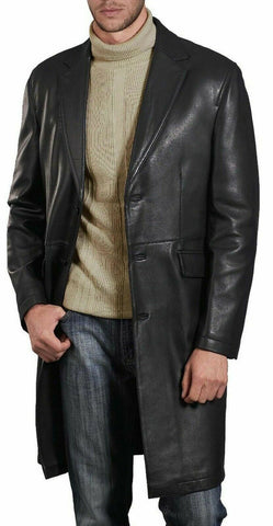 Noora New Lambskin Mens Black Leather Trench Coat | Casual Overcoat Knee Length Style Coat, Shiny Coat YK098