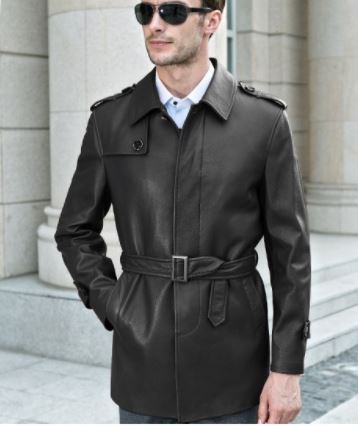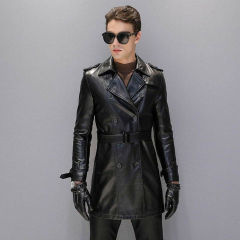Noora Men's Leather Overcoat Jacket Trench Coat Belted Lapel Business Mid Long