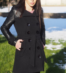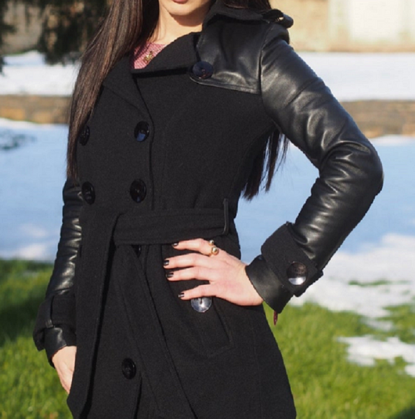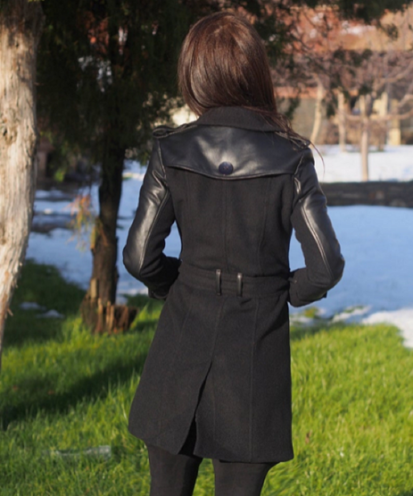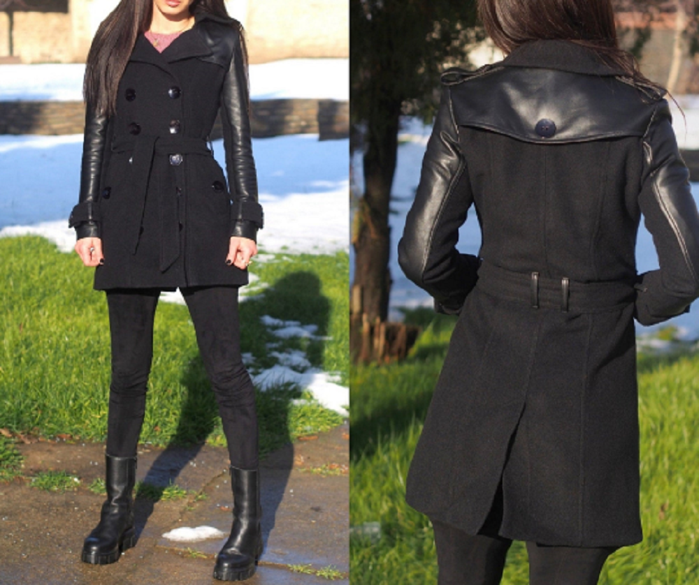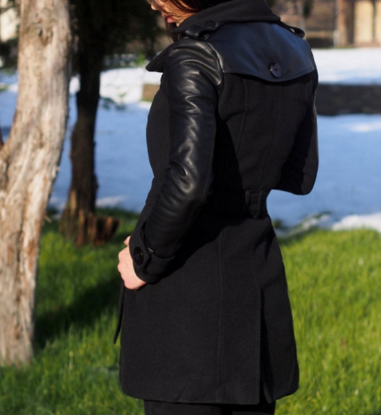 NOORA Womens Black Leather Belted Mini Trench Coat With Button & Pocket , Combination Of Leather & Suede | ST0100