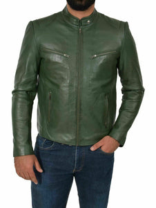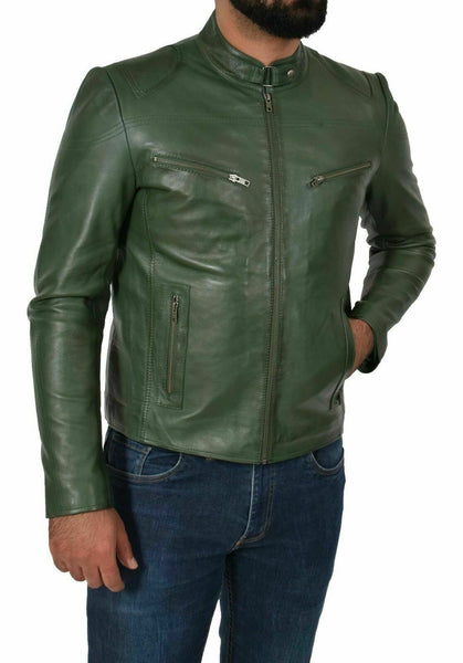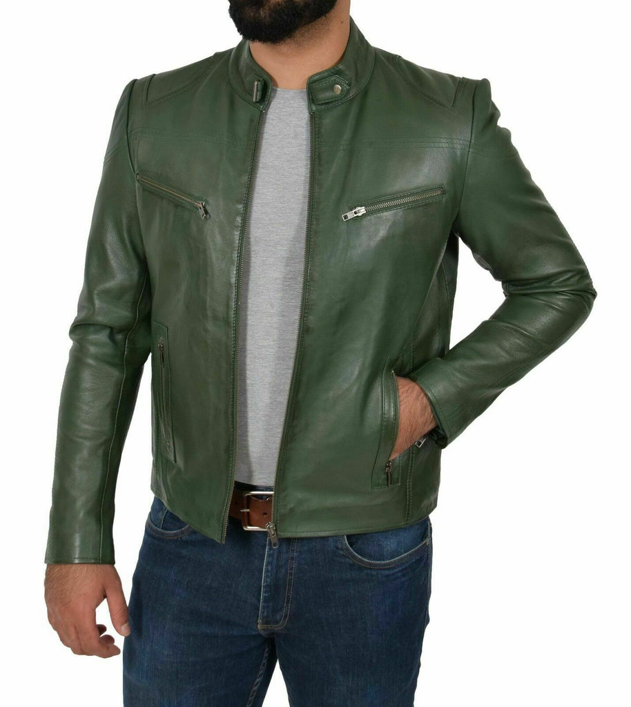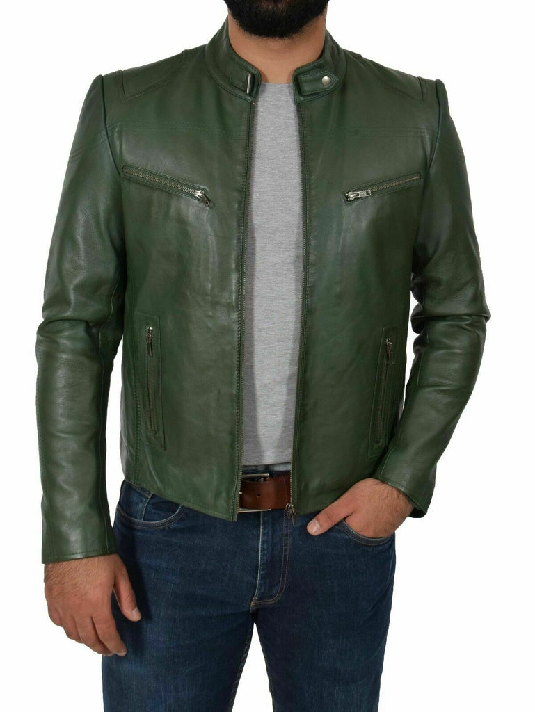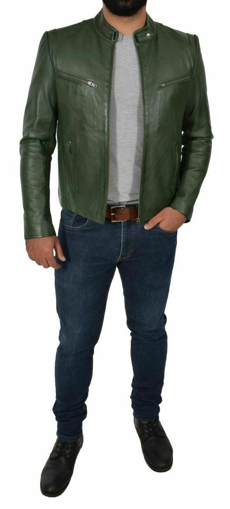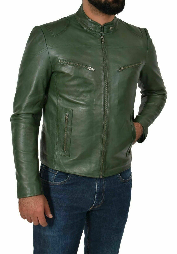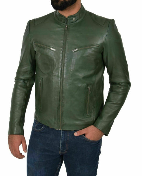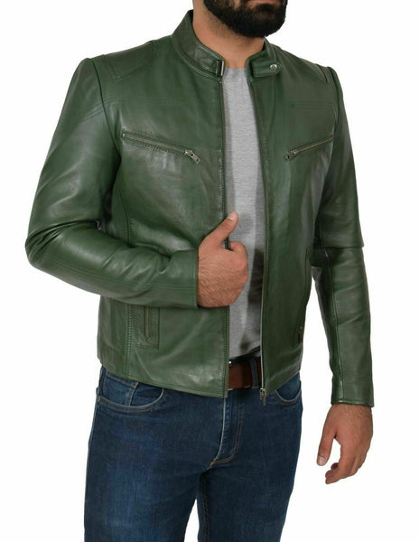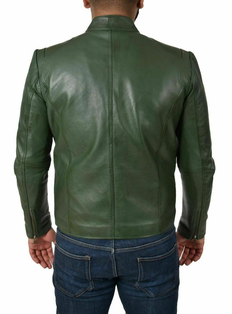 Genuine Leather Biker Jacket For Mens Green Fitted Zipped Casual Coat
