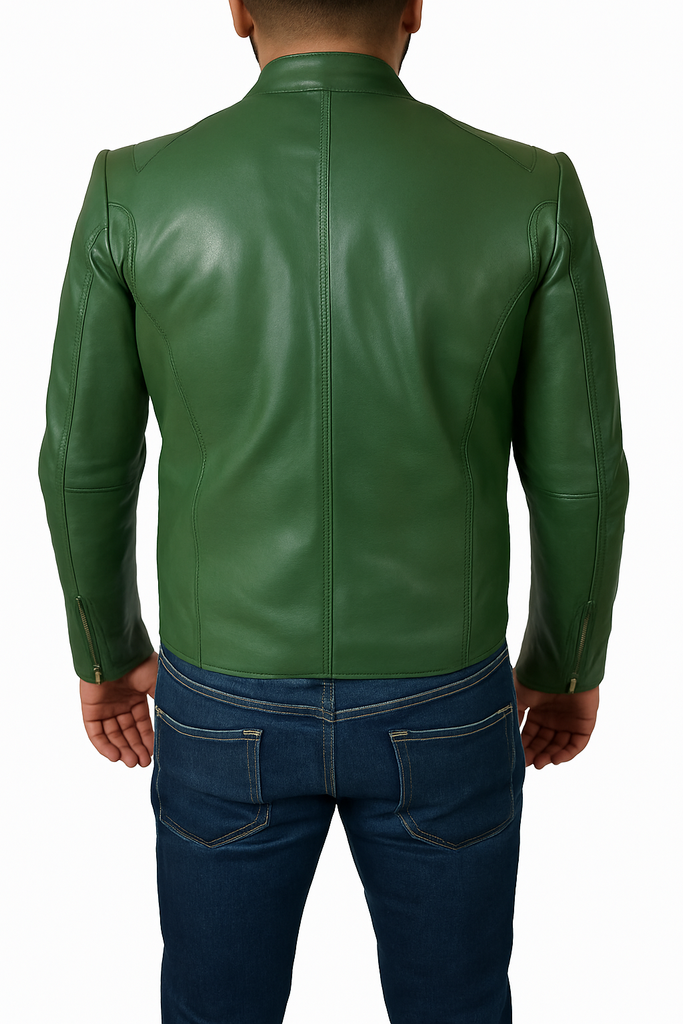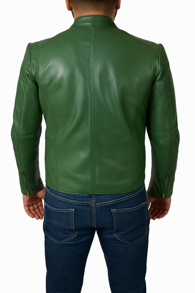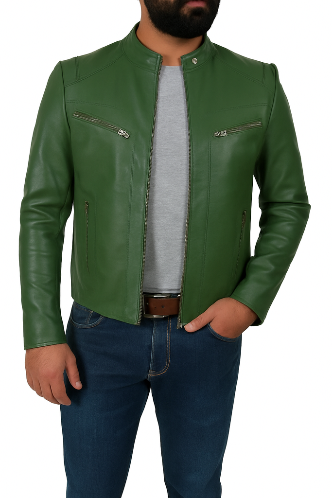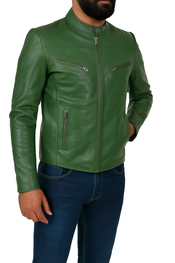 Noora Men’s Genuine Green Biker Leather Jacket – Casual Style with Zipper & Pockets