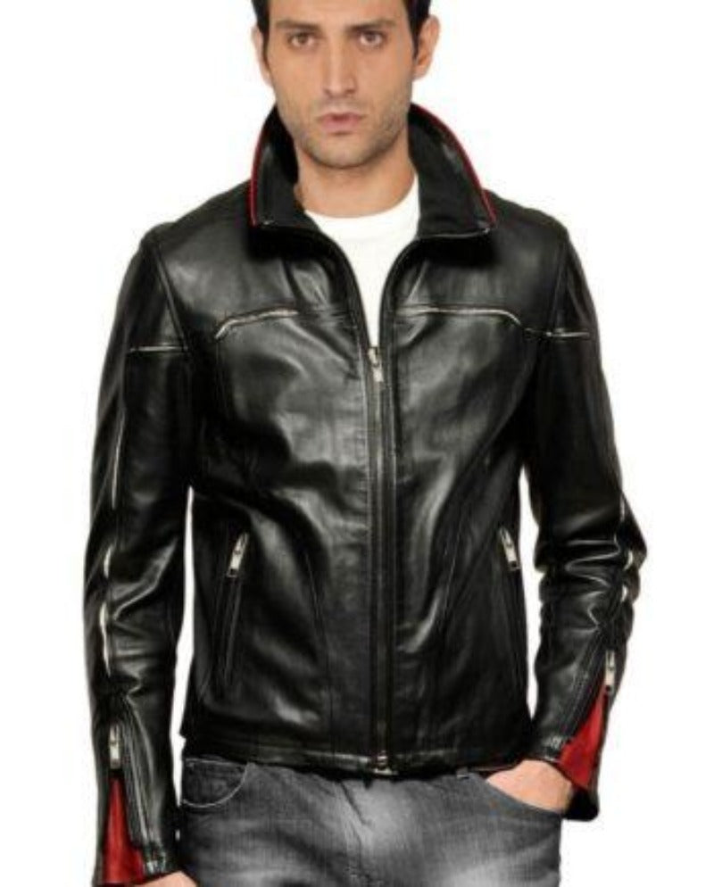 Men's fitted black leather jacket with red detailing,leather jacket from men,leather jackets online men,customized leather jackets men online,men leather jackets