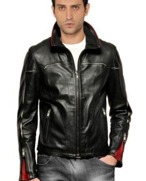 Noora Men's Lambskin Leather Trendy Look Slim fit Motorcycle Biker Jacket Designer Black With Red Combination Leather Jacket SU09