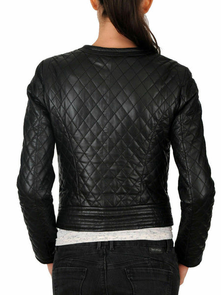 NOORA WOMEN'S DIAMOND QUILTED LADIES SLIM FIT BLACK BIKER LEATHER JACKET NI-1