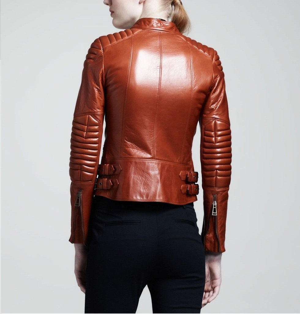 Noora Women's Detailed Burnt Orange Quilted Biker leather jacket ST030 – Noora International
